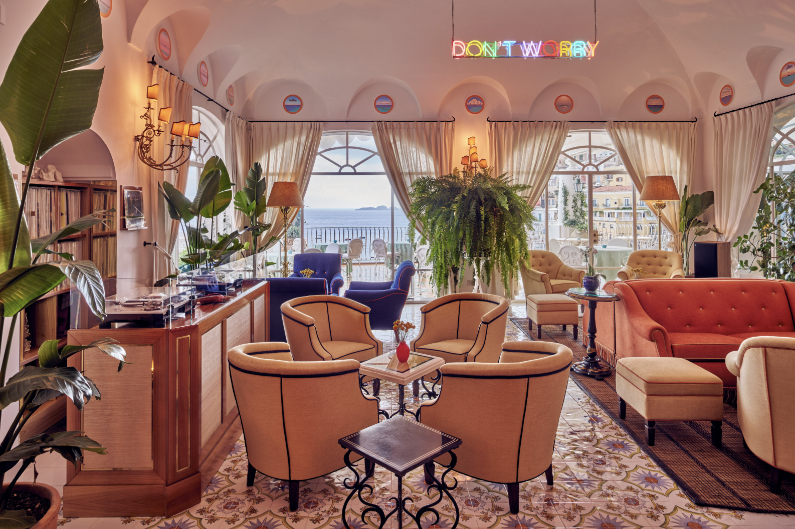 During his world travels, Aldo Sersale became captivated by the quiet ritual of the listening bars he encountered in Tokyo — intimate spaces where music is treated with the same reverence as a fine drink. The concept resonated deeply with him, reflecting both his own global sensibility and the Sersale family’s long-standing tradition of bringing international cultural influences into the life of Le Sirenuse. The hotel’s original bar, tucked within a suite of drawing rooms that once formed the heart of the Sersale family villa, felt like the natural home for this idea — discreet, atmospheric, and steeped in history. In the summer of 2024, Aldo’s vision came to life as the Don’t Worry Bar, a speakeasy-style hideaway where classic cocktails are paired with a curated soundscape of Italian and international jazz and pop, played on vinyl by a live DJ and rendered with warm clarity through a state-of-the-art sound system.