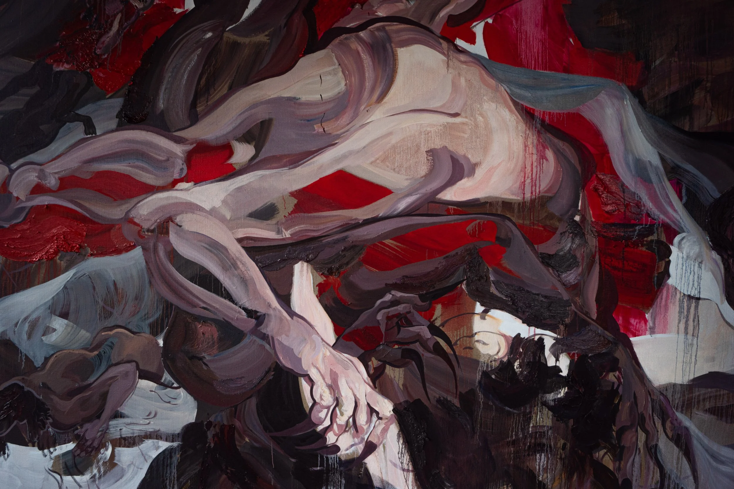 Mynerva describes painting as a “living process,” a “document of thinking and feeling.” This expressive realm serves as the starting point for projects that extend into other media or rethink the traditional conventions of the medium. Their raw, often erotic canvases draw upon religious and mythological visual tropes to depict bodies pushed to their limits, capturing rapturous figures in states of disintegration, metamorphosis, and communion. For their exhibition at SOCIÉTÉ, Mynerva’s artistic inquiry turns toward love for the first time—one of humanity’s oldest fabulations. Mynerva will transform the gallery into an immersive textile installation centered around a large oil painting of fluid anatomies suggesting both complicity and affection, healing and desire. Attending these entwined, ecstatic bodies are four smaller paintings of figures that function as witnesses. This gap between witnessing and experience reveals love as a structure of lack, recasting it as a dramatic event that carries anguish, despair, and desire. Love, like painting, can function as an attempt to articulate that which cannot be said: what remains of love when the image collapses? When the body no longer responds to the illusion of completeness, and only pleasure, the gaze, and yearning remain?